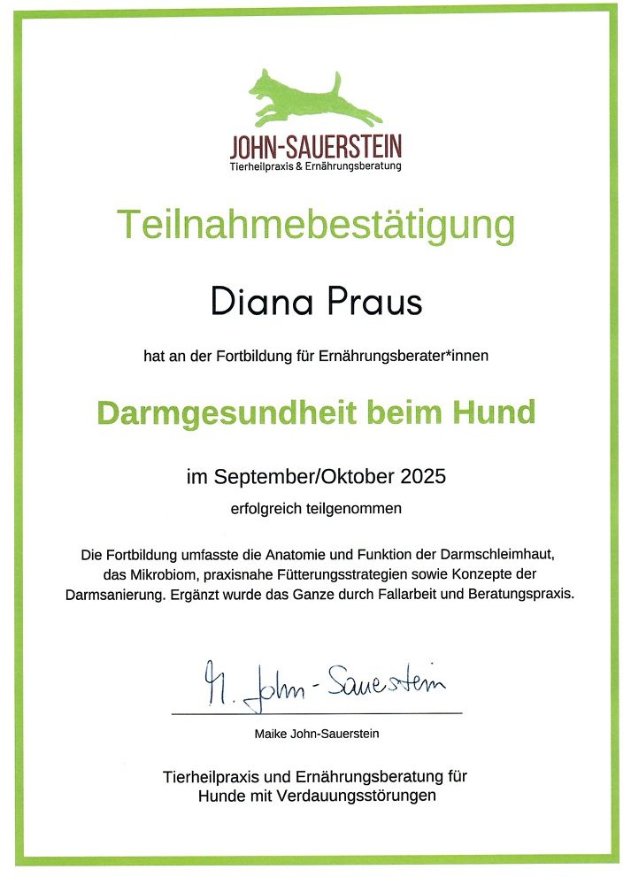 Meine eigene Hündin veranlasste mich dazu mehr lernen und anwenden zu wollen. Heute fließt dieses Wissen mit in die ganzheitliche Ernährungsberatung mit ein.